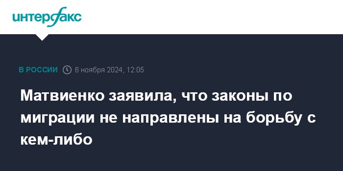 "Мы не против кого-то боремся. Мы наводим в своей собственной стране порядок, который давно надо было навести, особенно в части нелегальной, незаконной миграции, которая наносит большой ущерб не только нам, но и государствам, которые они (мигранты - ИФ) представляют", - сказала Матвиенко на заседании Совета Федерации в среду при обсуждении целого пакета законов, направленных на борьбу с нелегальной миграцией.