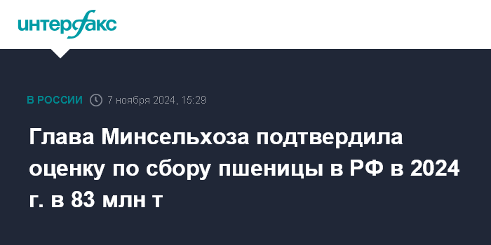 Глава Минсельхоза подтвердила оценку по сбору пшеницы в РФ в 2024 г. в 83 млн т