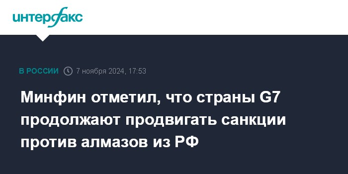 Москва. 7 ноября. INTERFAX.RU - Страны G7, несмотря на частичное ослабление в августе этого года санкций в отношении бриллиантов российского происхождения, продолжают работу по продвижению рестрикций, говорится в тексте комментариев замминистра финансов РФ Алексея Моисеева, размещенном на сайте Минфина.