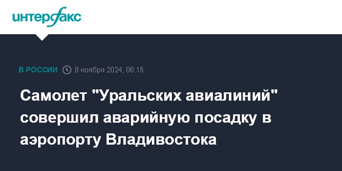 Москва. 8 ноября. INTERFAX.RU - Самолет, выполнявший рейс из Екатеринбурга, в пятницу совершил аварийную посадку в аэропорту Владивостока, сообщила Дальневосточная транспортная прокуратура.