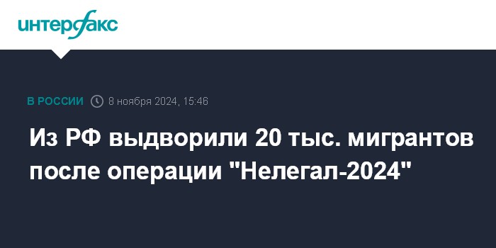 Москва. 8 ноября. INTERFAX.RU - В результате проведенной полицейскими операции "Нелегал-2024" из России выдворены и депортированы 20 тысяч иностранных граждан, сообщила официальный представитель МВД РФ Ирина Волк.