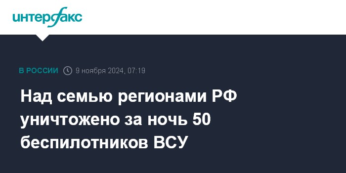 Москва. 9 ноября. INTERFAX.RU - Минобороны РФ сообщило, что в ночь на субботу средствами ПВО уничтожено 50 украинских беспилотников самолетного типа над семью регионами России.