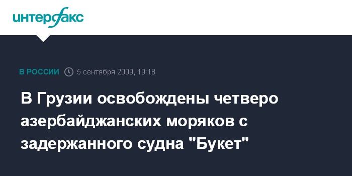 Баку. 5 сентября. ИНТЕРФАКС-АЗЕРБАЙДЖАН - Четверо моряков - граждан Азербайджана, находившиеся на борту судна "Букет", задержанного в августе грузинскими пограничниками, смогут вернуться на родину в понедельник, сообщил агентству "Интерфакс-Азербайджан" пресс-секретарь МИД Азербайджана Эльхан Полухов.