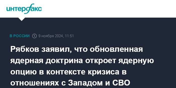 Москва. 9 ноября. INTERFAX.RU - Обновленная российская ядерная доктрина даст возможность обращения к ядерной опции при обстоятельствах, связанных с острым кризисом в отношениях России с Западом и с ситуацией на Украине, заявил замглавы МИД РФ Сергей Рябков.