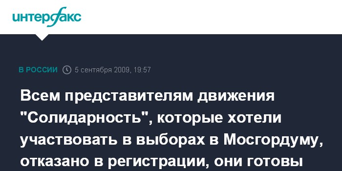 Всем представителям движения "Солидарность", которые хотели участвовать в выборах в Мосгордуму, отказано в регистрации, они готовы жаловаться в суд