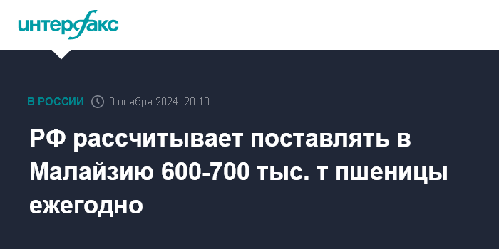 РФ рассчитывает поставлять в Малайзию 600-700 тыс. т пшеницы ежегодно