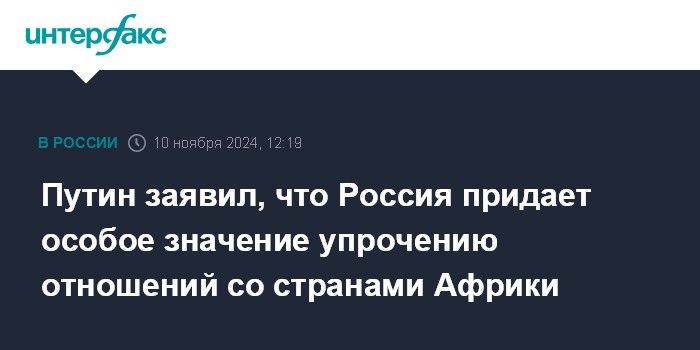 Москва. 10 ноября. INTERFAX.RU - Президент России Владимир Путин заявил о возрастании роли стран Африки на мировой арене, особом значении для России отношений с африканскими партнерами.