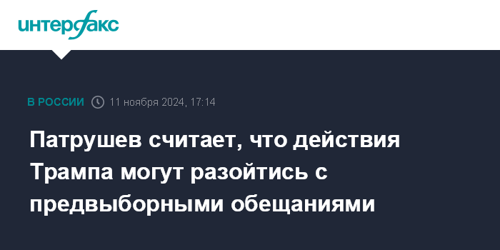 "Но избирательная кампания завершилась, и в январе 2025 года наступит время для конкретных дел избранного президента. Известно же, что зачастую предвыборные обещания в США могут и расходиться с последующими действиями", - сказал Патрушев.