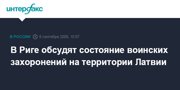 Москва. 6 сентября. INTERFAX.RU - В Риге в начале следующей недели пройдет первое заседание российско-латвийской межправительственной комиссии по обустройству находящихся на территории Латвии захоронений советских воинов, сообщил "Интерфаксу-АВН" генерал-майор Александр Кирилин, начальник управления Минобороны по увековечению памяти погибших при защите Отечества.
