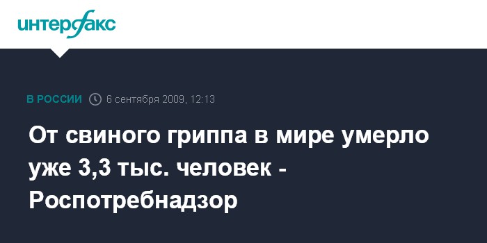 Москва. 6 августа. INTERFAX.RU - Число погибших во всем мире от вируса гриппа А (H1N1), известного как свиной грипп, составляет почти 3,3 тыс. человек, сообщил Роспотребнадзор.