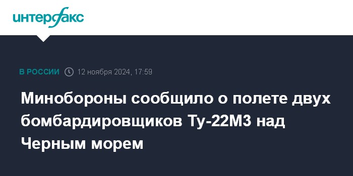 Москва. 12 ноября. INTERFAX.RU - Два дальних бомбардировщика Ту-22М3 ВКС России выполнили плановый полет в воздушном пространстве над нейтральными водами акватории Черного моря, сообщили в Минобороны России.