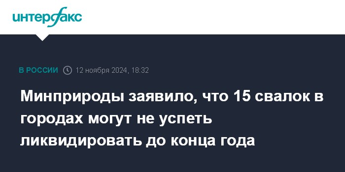 Москва. 12 ноября. INTERFAX.RU - Риск того, что ликвидация несанкционированных свалок в границах городов в рамках федерального проекта "Чистая страна" не будет завершена до конца текущего года, существует по 15 объектам, сообщил министр природных ресурсов и экологии Александр Козлов на заседании оперативного штаба, говорится в сообщении пресс-службы Минприроды.