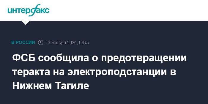 Москва. 13 ноября. INTERFAX.RU - ФСБ сообщила о задержании россиянина, планировавшего теракт на электроподстанции в Нижнем Тагиле, обеспечивающей энергоснабжение одного из предприятий ВПК региона и инфраструктуру объектов Свердловской железной дороги.