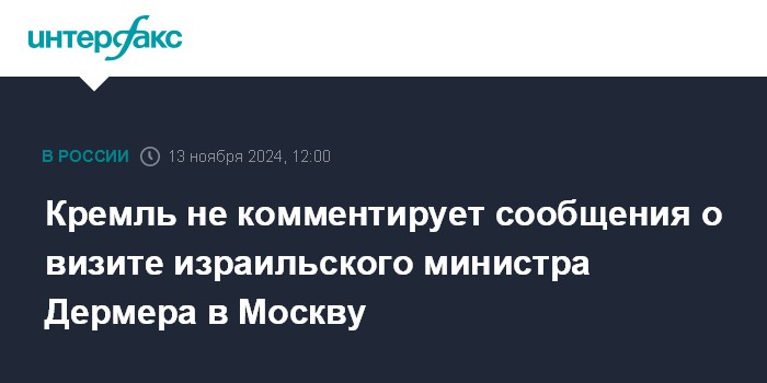 Москва. 13 ноября. INTERFAX.RU - В Кремле не комментируют сообщения о том, что министр стратегического планирования Израиля Рон Дермер посещал Москву в рамках кампании Тель-Авива по получению гарантий безопасности от России и США.