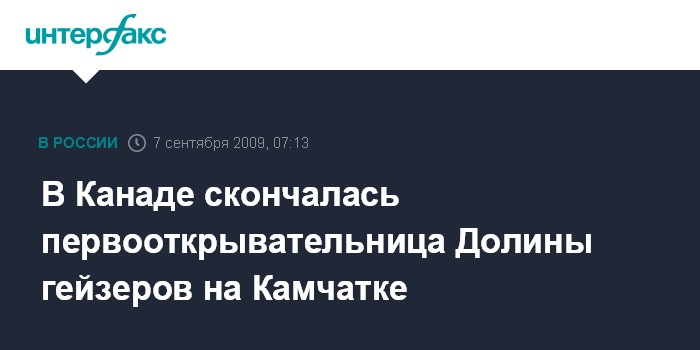 Петропавловск-Камчатский. 7 сентября. ИНТЕРФАКС-ДАЛЬНИЙ ВОСТОК - Татьяна Устинова, открывшая Долину гейзеров на Камчатке, скончалась в канадском Ванкувере 4 сентября на 97 году жизни, сообщил агентству "Интерфакс-Дальний Восток" в понедельник заместитель директора по науке Кроноцкого государственного природного биосферного заповедника Владимир Мосолов.