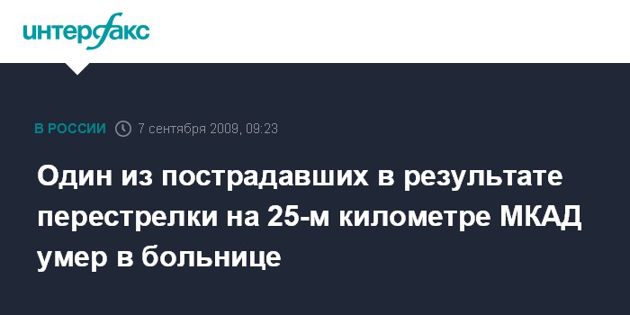 Москва. 7 сентября. INTERFAX.RU – В больнице скончался один из пятерых раненых в результате стрельбы на территории торгового комплекса "Эмерал", сообщил "Интерфаксу" источник в правоохранительных органах в понедельник.