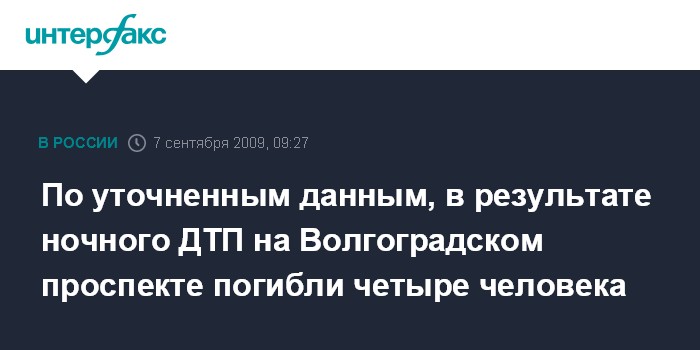 Москва. 7 сентября. INTERFAX.RU – В результате дорожно-транспортного происшествия на Волгоградском проспекте, произошедшего в ночь на понедельник, погибли, по уточненным данным, четыре человека, сообщил "Интерфаксу" источник в правоохранительных органах.