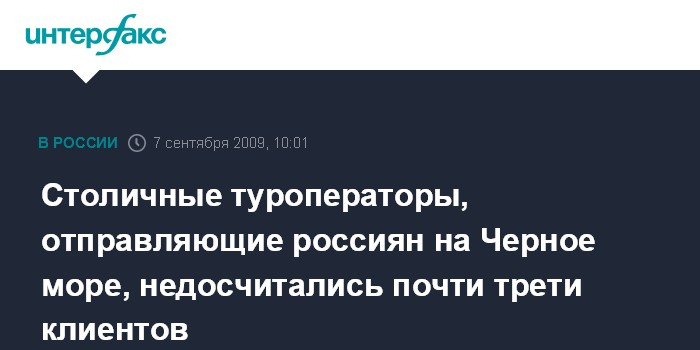 Москва. 7 сентября. INTERFAX.RU – На начало сентября московские туроператоры оценивают падение продаж по курортам Краснодарского края и Крыма в среднем в 25-30% по сравнению с прошлым годом.