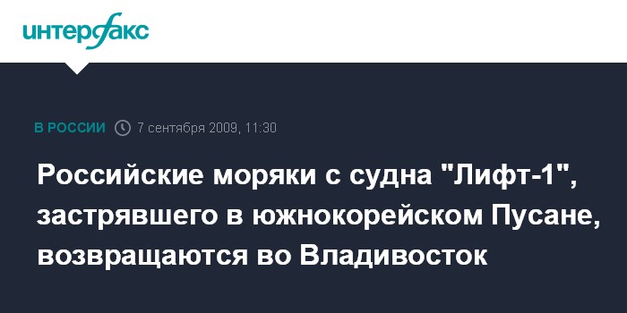 Москва. 7 сентября. INTERFAX.RU – Российские моряки, оказавшиеся брошенными на судне "Лифт-1" (флаг Республики Вануату) в южнокорейском порту Пусан, возвращаются на родину.
