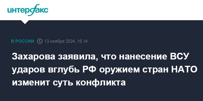 Захарова заявила, что нанесение ВСУ ударов вглубь РФ оружием стран НАТО изменит суть конфликта