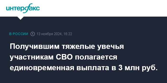 Москва. 13 ноября. INTERFAX.RU - Военнослужащие, получившие тяжелые увечья и травмы в ходе СВО, будут иметь право на единовременную выплату в 3 млн рублей, получившим легкие ранения полагается 1 млн рублей, а получившим иные травмы будет полагаться 100 тыс. рублей.