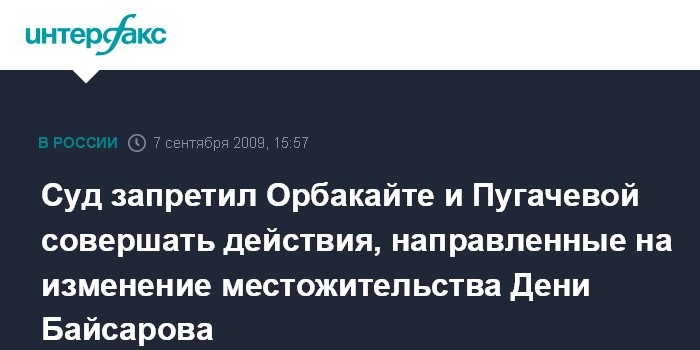 Как отметил адвокат, свое ходатайство Байсаров обосновывал тем, что в СМИ К.Орбакайте и ее мать Алла Пугачева распространяют информацию о том, что бизнесмен похитил и силой удерживает ребенка. "Это не соответствует действительности, поскольку до появления этих публикаций Орбакайте точно знала местонахождение сына", - сказал он. "Учитывая тот факт, что Кристина Орбакайте и Алла Пугачева придали огласке сугубо семейное дело об определении места жительства ребенка, искажая фактические данные, добиваясь скандала вокруг данного судебного спора, мы просили суд применить по данному делу обеспечительные меры в виде запрета К.Орбайкайте и А.Пугачевой совершать действия, направленные на изменение места жительства несовершеннолетнего Дени Байсарова", - отметил Добровинский. "Мы просили, пока идет судебное разбирательство, чтобы ребенок оставался там, где он есть сегодня", - добавил он.