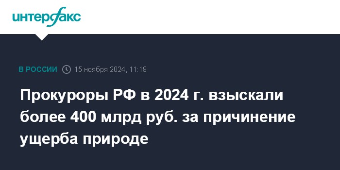 Москва. 15 ноября. INTERFAX.RU - Генпрокурор РФ Игорь Краснов сообщил, что в текущем году российские прокуроры взыскали более 400 млрд рублей в качестве компенсаций причиненного окружающей среде ущерба.