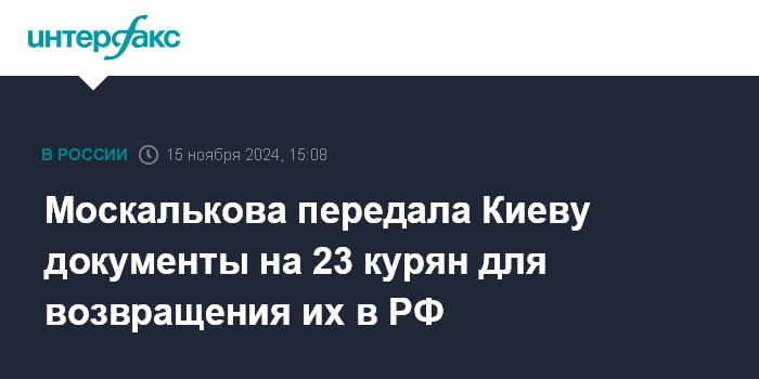 Москва. 15 ноября. INTERFAX.RU - Уполномоченный по правам человека в РФ Татьяна Москалькова передала украинской стороне документы на 23 перемещенных на Украину жителей Курской области для возвращения их домой.