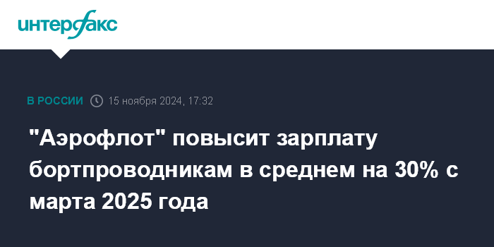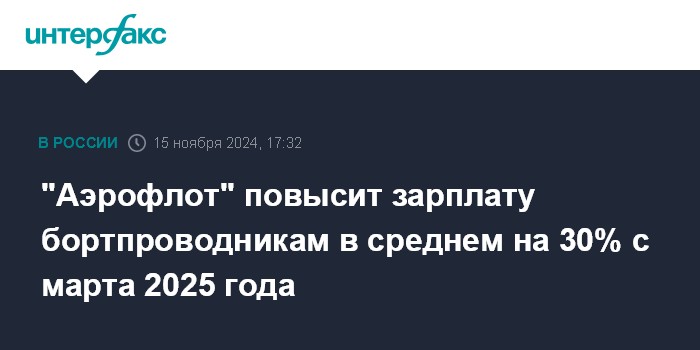 Москва. 15 ноября. INTERFAX.RU - Заработные платы бортпроводников "Аэрофлота" с 1 марта 2025 года будут проиндексированы в среднем на 30%, сообщила компания.