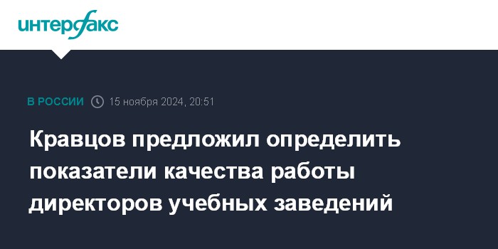 Москва. 15 ноября. INTERFAX.RU - В России необходимо определить общие показатели, регламентирующие качество работы директоров в образовательных организациях, считает министр просвещения Сергей Кравцов. Его мнение привела пресс-служба Центра знаний "Машук".