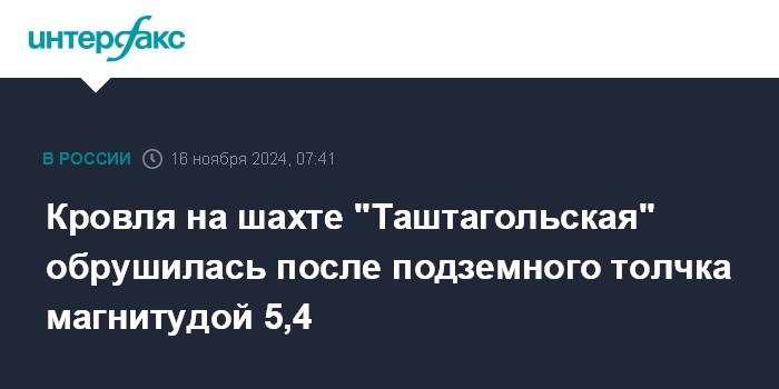 "Сегодня, 16 ноября, после произошедшего в горном отводе шахты "Таштагольская" зарегистрированного геодинамического явления (толчок) с энергетическим классом 5,4 произошло обрушение горной массы с кровли горной выработки", - говорится в сообщении.
