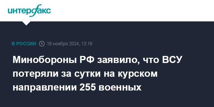 Москва. 16 ноября. INTERFAX.RU - Потери украинских войск на курском направлении за минувшие сутки составили 255 военнослужащих, сообщило министерство обороны РФ в субботу.