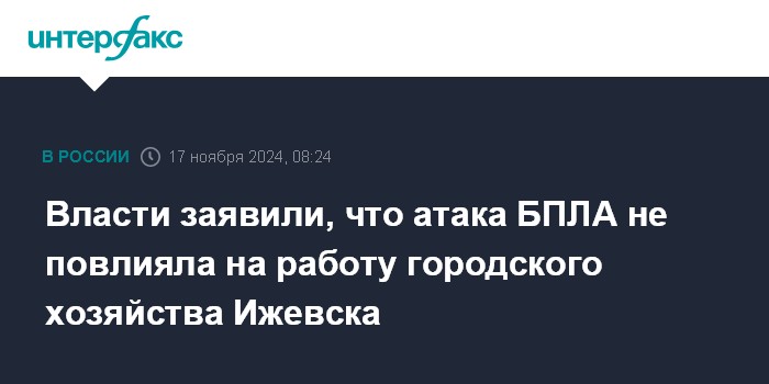 Москва. 17 ноября. INTERFAX.RU - Все объекты коммунальной инфраструктуры и транспорт Ижевска работают в штатном режиме после атаки БПЛА в воскресенье утром, сообщил глава города Дмитрий Чистяков.