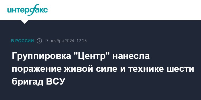 Москва. 17 ноября. INTERFAX.RU - Войска группировки "Центр" ведут продвижение в глубину обороны вооруженных сил Украины, нанесли поражение живой силе и боевой технике шести бригад противника, сообщило Минобороны РФ в воскресенье.