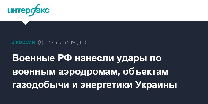 Москва. 17 ноября. INTERFAX.RU - Российские военные сообщили, что за минувшие сутки нанесли поражение военным аэродромам, объектам газодобычи, энергетики, используемым для работы предприятий военно-промышленного комплекса Украины.