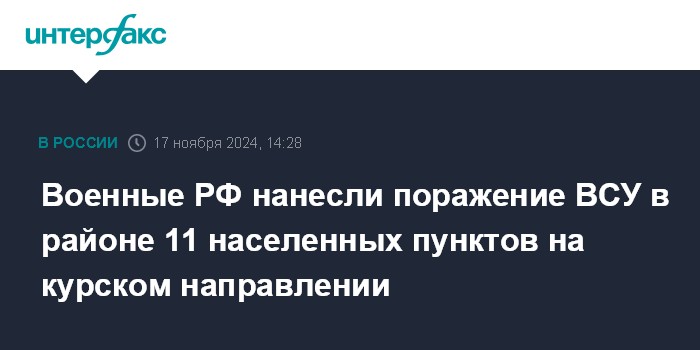 Москва. 17 ноября. INTERFAX.RU - Войска группировки "Север" на курском направлении за сутки нанесли поражение украинским формированиям в районе одиннадцати населенных пунктов, сообщает Минобороны РФ в воскресенье.