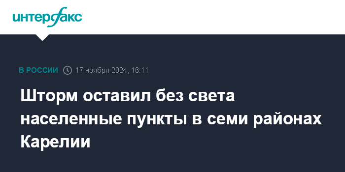 Москва. 17 ноября. INTERFAX.RU - Населенные пункты в семи районах Карелии остались без электричества из-за шторма, сообщает Минстрой республики в воскресенье.