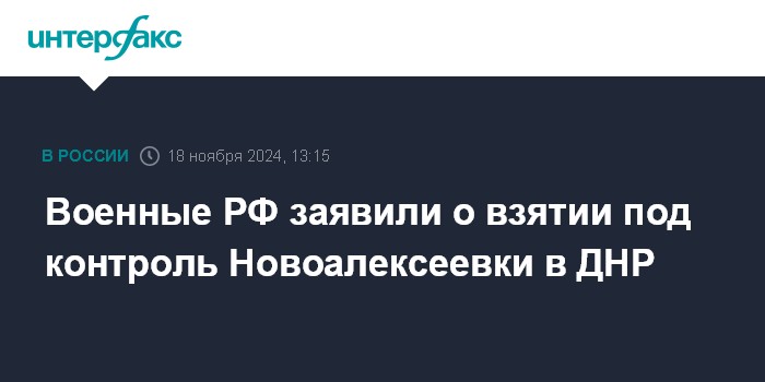 Москва. 18 ноября. INTERFAX.RU - Войска группировки "Центр" взяли под контроль населённый пункт Новоалексеевка в ДНР, сообщает министерство обороны РФ.
