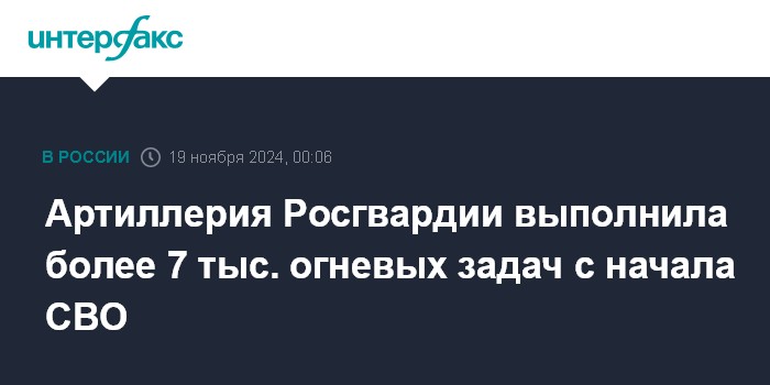 Москва. 19 ноября. INTERFAX.RU - Артиллеристы Росгвардии за время специальной военной операции выполнили более 7 тыс. огневых задач, уничтожили сотни военнослужащих ВСУ, десятки единиц орудий и минометов, сообщили в ведомстве.