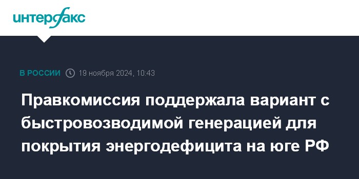 Москва. 19 ноября. INTERFAX.RU - Правительственная комиссия по электроэнергетике на заседании во вторник поддержала самый дешевый вариант с быстровозводимой генерацией для покрытия энергодефицита на юге РФ, сообщил в среду журналистам замминистра энергетики РФ Евгений Грабчак.