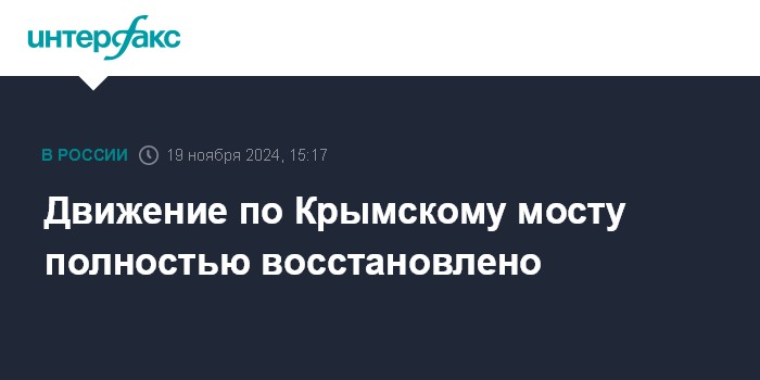 Москва. 19 ноября. INTERFAX.RU - Движение транспорта по Крымскому мосту полностью восстановлено, в том числе для пассажирских автобусов, сообщил телеграм-канал, освещающий ситуацию на автомобильных подходах к мосту.