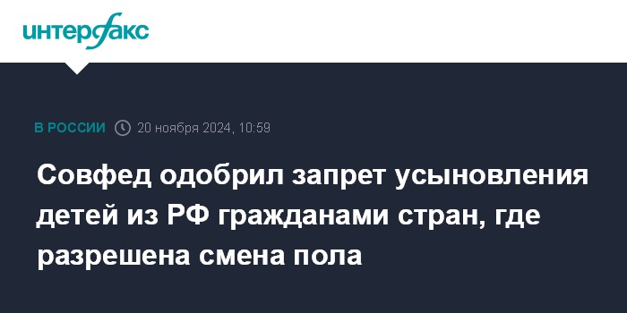 Москва. 20 ноября. INTERFAX.RU - Совет Федерации на заседании в среду проголосовал за закон о запрете на усыновление или опекунство детей из России для граждан государств, где разрешена смена пола.