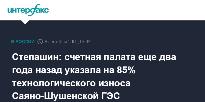 "Два года назад была проверена Счетной палатой Саяно-Шушенская ГЭС, где мы указали, что там 85% технологического износа. Было направлено представление в правительство и письмо в Генеральную прокуратуру. Ответ был следующий: это акционерное общество, вот за счет акционеров пусть они там все и восстанавливают", - сказал С.Степашин на совещании в Барнауле во вторник.