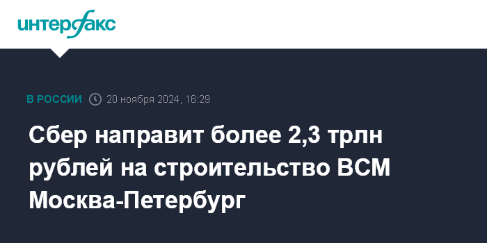 Сбер направит более 2,3 трлн рублей на строительство ВСМ Москва-Петербург