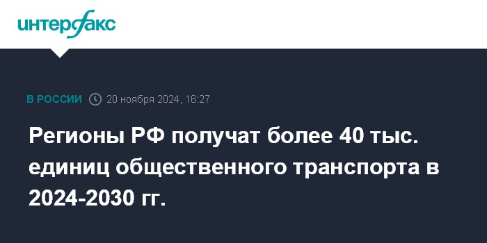 Москва. 20 ноября. INTERFAX.RU - Объем поставок общественного транспорта в российские регионы в 2024-2030 годах превысит 40 тыс. единиц, сообщил премьер-министр Михаил Мишустин в ходе пленарной сессии форума "Транспорт России".