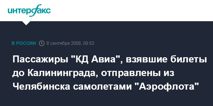 Москва. 8 сентября. INTERFAX.RU - Утром во вторник 50 пассажиров, купивших билеты авиакомпании "КД Авиа" на сегодняшний рейс до Калининграда, улетели из аэропорта Челябинска рейсом "Аэрофлота".