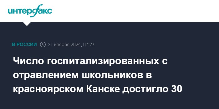 Москва. 21 ноября. INTERFAX.RU - Число школьников, госпитализированных с кишечной инфекцией в красноярском городе Канске, достигло 30, сообщили журналистам в пресс-службе СУ СКР по Красноярскому краю и Республике Хакасия в четверг.
