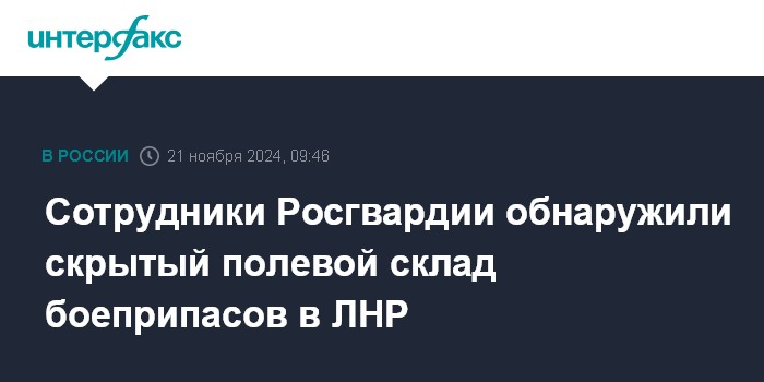 Москва. 21 ноября. INTERFAX.RU - Скрытый полевой склад с боеприпасами обнаружен в Луганской народной республике, изъято более 200 снарядов и взрывателей, а также около 4 тысяч патронов, сообщили в пресс-службе Росгвардии.