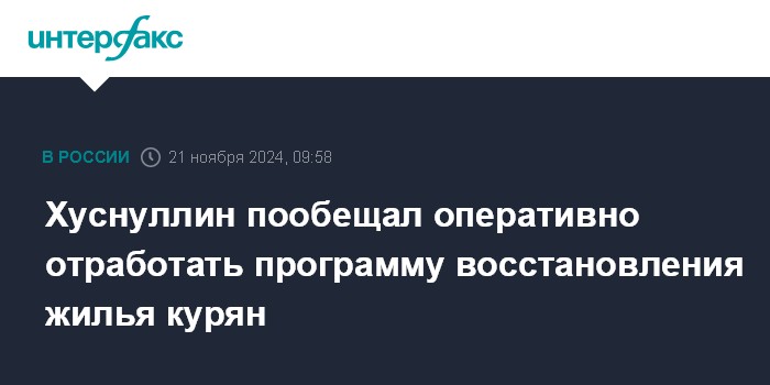 Москва. 21 ноября. INTERFAX.RU - Программу восстановления жилья в Курской области отработают оперативно, такой опыт уже есть, заявил телеканалу "Россия 24" вице-премьер Марат Хуснуллин.