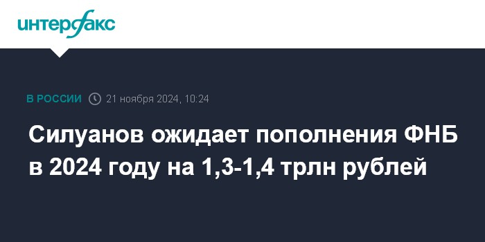 Москва. 21 ноября. INTERFAX.RU - Министр финансов Антон Силуанов ожидает пополнения Фонда национального благосостояния в 2024 году на сумму около 1,3-1,4 трлн рублей.